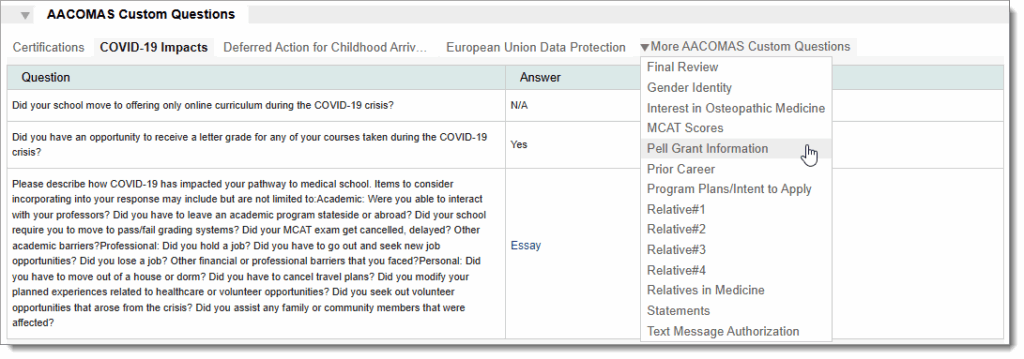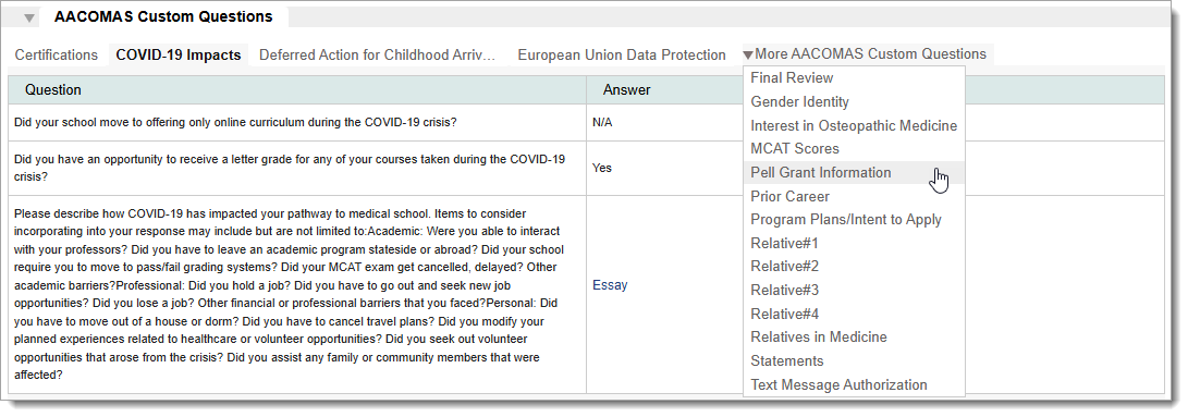 The CAS Custom Questions panel on the Applicant Details page stores all of a CAS’s custom questions and question blocks from the Personal Information, Academic History, and Supporting Information sections. Previously, all questions and question blocks were grouped together. With this enhancement, each question block now has its own subpanel, with the applicable questions listed underneath it. Note the following: