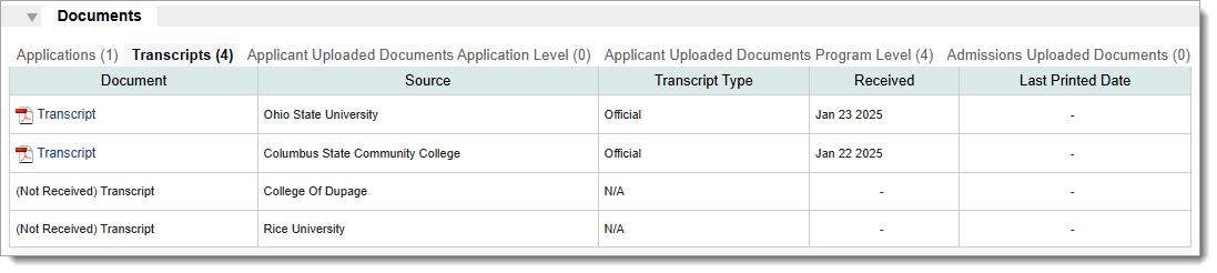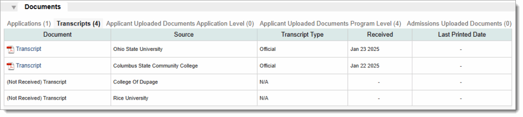 The Transcripts subpanel under the Documents panel on the Applicant Details page lists each college the applicant attended. Previously, (Pending) was listed for each college’s transcript, which led to the assumption that NursingCAS had received the transcript and it was pending processing. However, a CAS or program may not have required a transcript, or it may not have arrived at NursingCAS, and so the (Pending) indicator was misleading. With this enhancement, (Pending) has been updated to (Not Received) for clarification and accuracy.