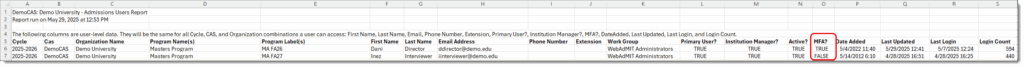 The Admissions Users report in the Report Manager creates a report focusing on your program’s admissions users’ basic information within WebAdMIT. With this enhancement, a new column has been added to the report that will indicate if the user has enabled multi-factor authentication (MFA). This gives you additional insight into your users’ account setups.