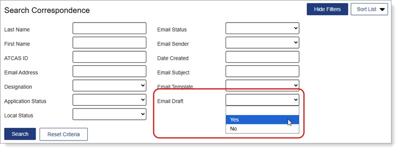 • Search Correspondence Page: Email Draft Filter You can now quickly filter emails in a Draft status from the Search Correspondence page.